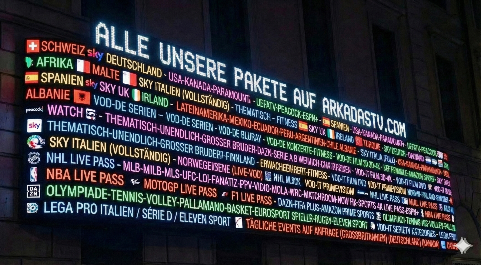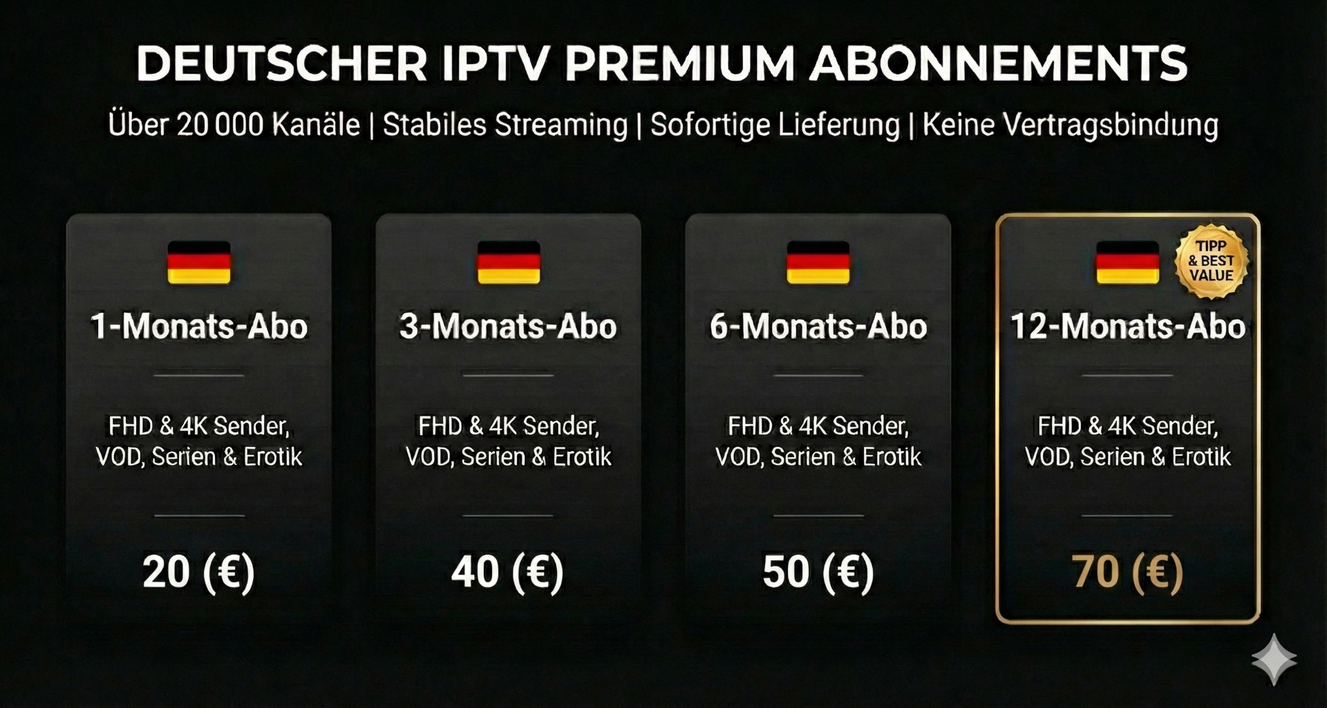 Nutzen Sie die Gelegenheit und sichern Sie sich Zugang zur weltweiten IPTV-Vielfalt – in der Zuverlässigkeit und Bildqualität, die Sie von Schweizer Standards erwarten!