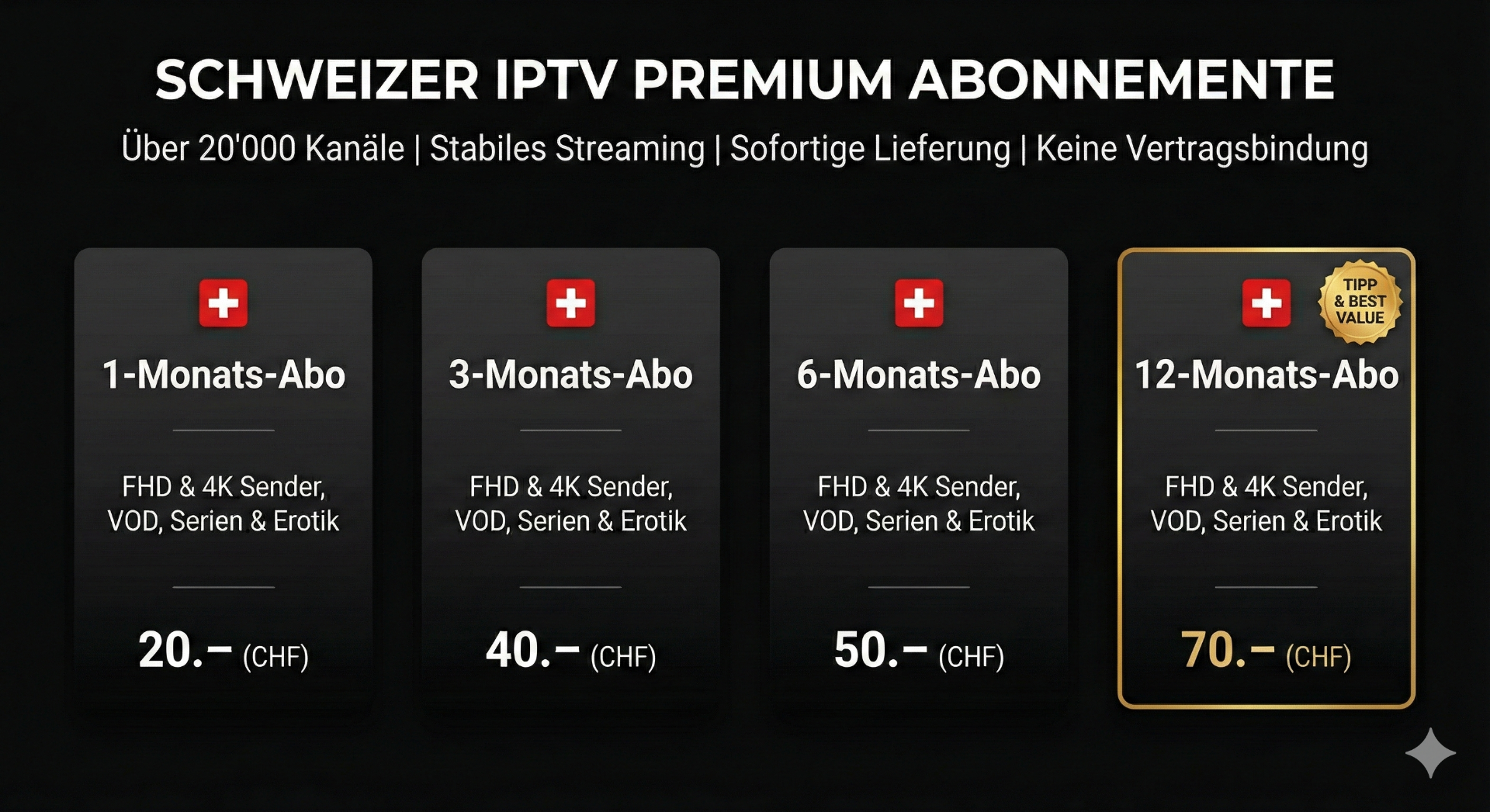 Nutzen Sie die Gelegenheit und sichern Sie sich Zugang zur weltweiten IPTV-Vielfalt – in der Zuverlässigkeit und Bildqualität, die Sie von Schweizer Standards erwarten!
